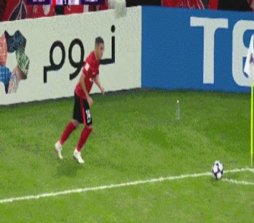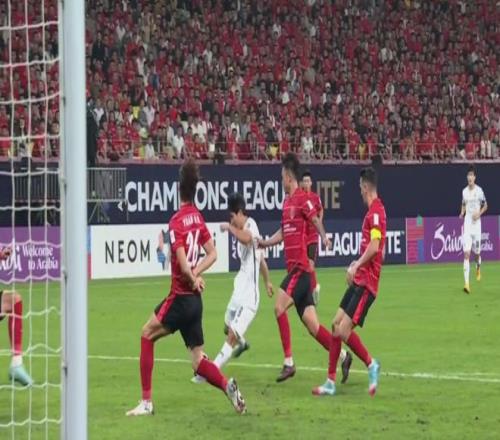 第34分鐘,周定洋進球了,這也是成都蓉城頂住了江原隊一頓狂攻之后的一次沉重的反擊。當(dāng)時成都蓉城獲得了一個角球機會,元敏誠在禁區(qū)內(nèi)擺渡至周定洋的腳下,周定洋迎球便射,將場上的比分改寫為1-0領(lǐng)先。