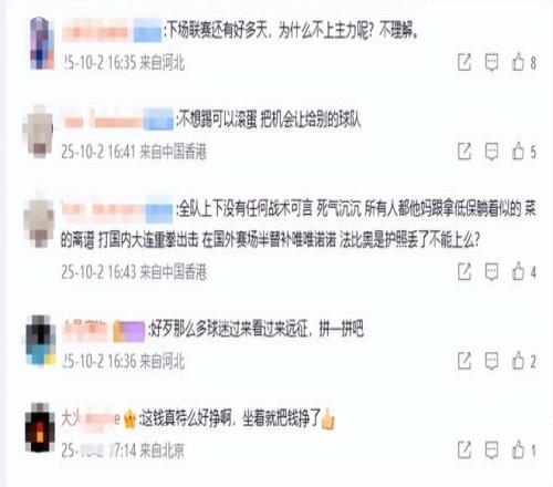 有的球迷將矛頭直指北京國安的某些球員:“這錢掙得真容易,坐著就把錢掙了?!薄懊俺渎殬I(yè)球員?!薄胺峨p杰還算是職業(yè)球員嗎?”也有球迷對塞蒂恩的戰(zhàn)術(shù)安排提出質(zhì)疑:“下一輪中超還有好多天呢,為什么要輪換呢?不是說全主力打亞冠嗎?”
