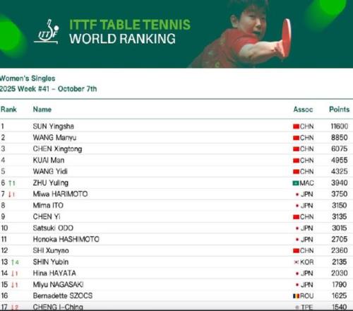 女子單打,中國隊球員孫穎莎、王曼昱、陳幸同、蒯曼、王藝迪位列前五,陳熠位列第九。