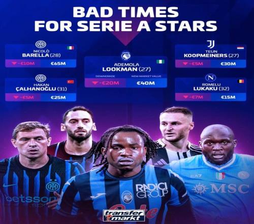 德轉(zhuǎn)更新后意甲球員身價(jià)跌幅Top20: