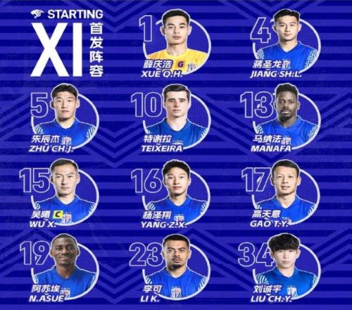 本場比賽,上海申花在首發(fā)上派出了1-薛慶浩、4-蔣圣龍、5-朱辰杰、13-馬納法、16-楊澤翔、15-吳曦、17-高天意、23-李可、10-特謝拉、19-阿蘇埃、34-劉誠宇